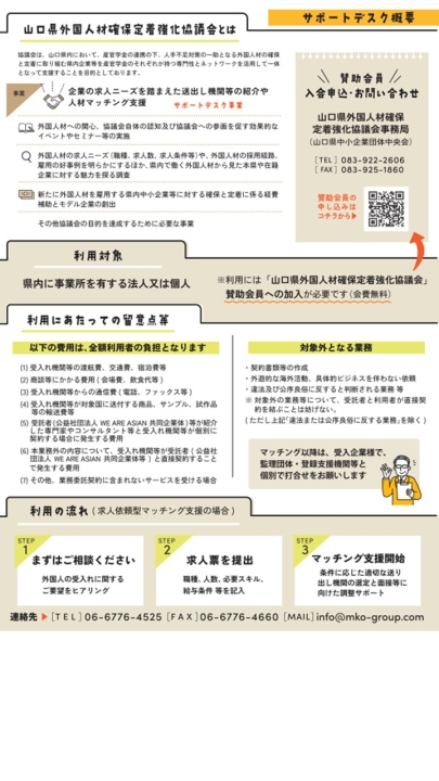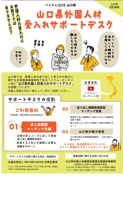 山口県では、産業人材の送り出しと受入れの協力に関する合意議事録締結先でああるベトナム・ホーチミン市に「山口県外国人材受入れサポートデスク」を設置しています。