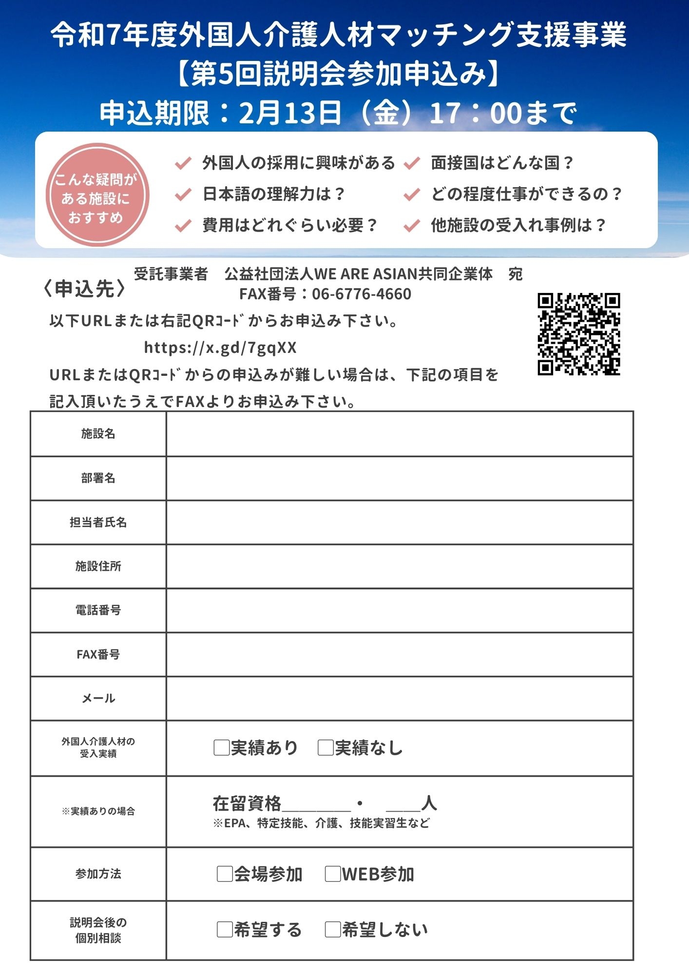 申込は、左のチラシでFAXもしくは、QRコード